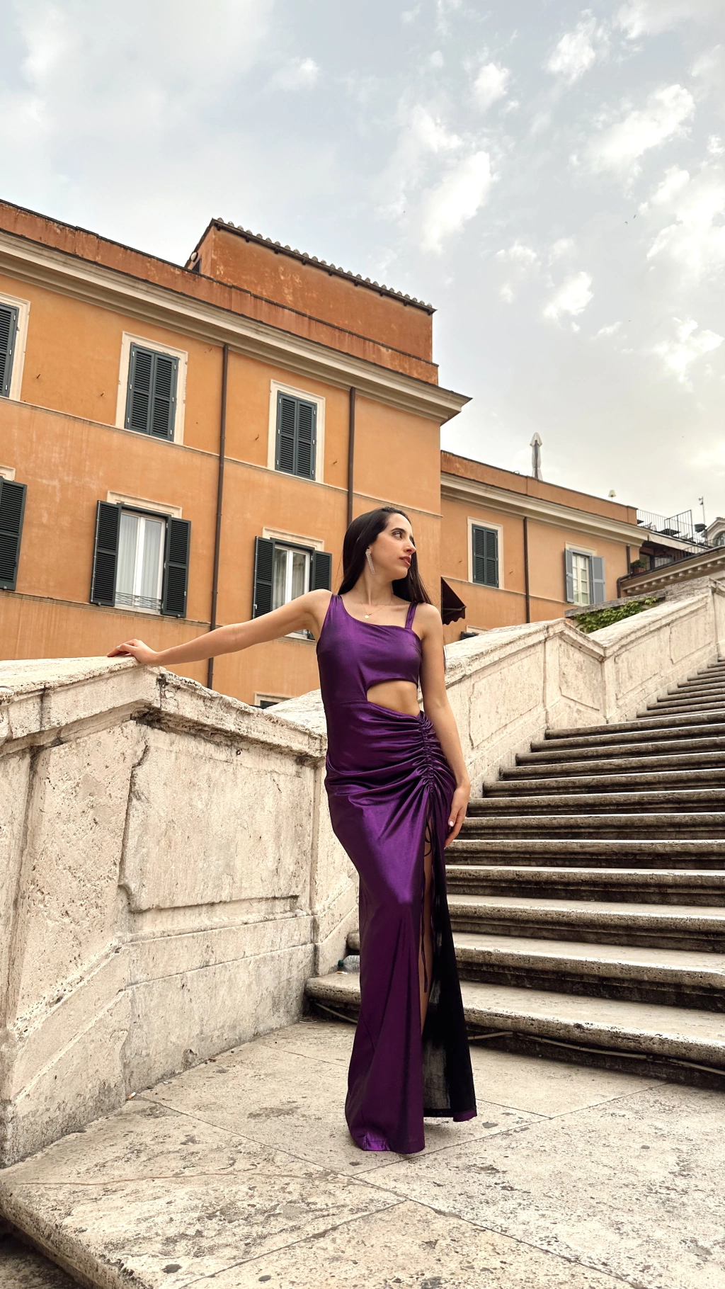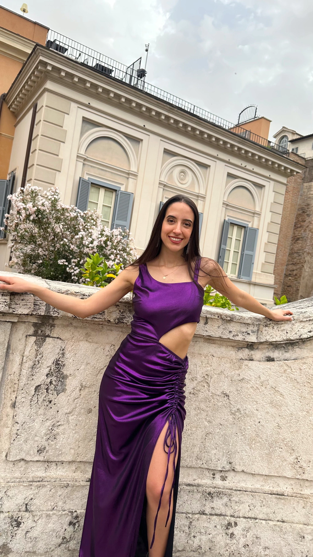 Vestido largo metalizado, elastizado. Con recorte en la cintura, falda con tajo y drapeado (podés regular el trajo con las tiritas que drapean). Está todo forrado en la parte superior y tiene forro corto en la falda.